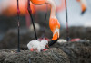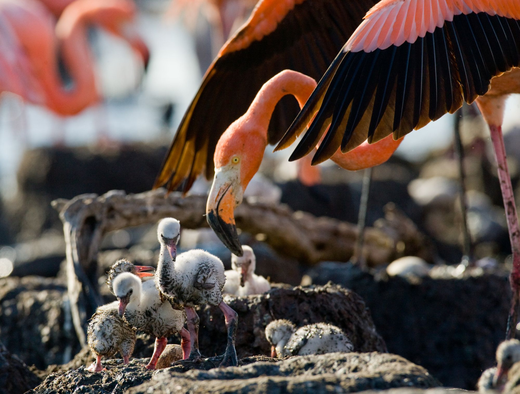 Dospělí karibští plameňáci se jako růžový nerodí, ale svoji barvu získávají v průběhu života. Mláďata plameňáků, jako jsou ti zde v biosférické rezervaci Ría Lagartos na mexickém poloostrově Yucatán, dospívají ve věku tří až pěti let, takže i když ještě nevypadají tak, jak si představujeme plameňáky, jejich typické růžové peří se brzy vyvine. Rudorůžové zbarvení pochází ze stravy plameňáků: Jedí potraviny, které obsahují mnoho alfa a beta karotenoidních pigmentů, jako jsou řasy, brouci, korýši a měkkýši.