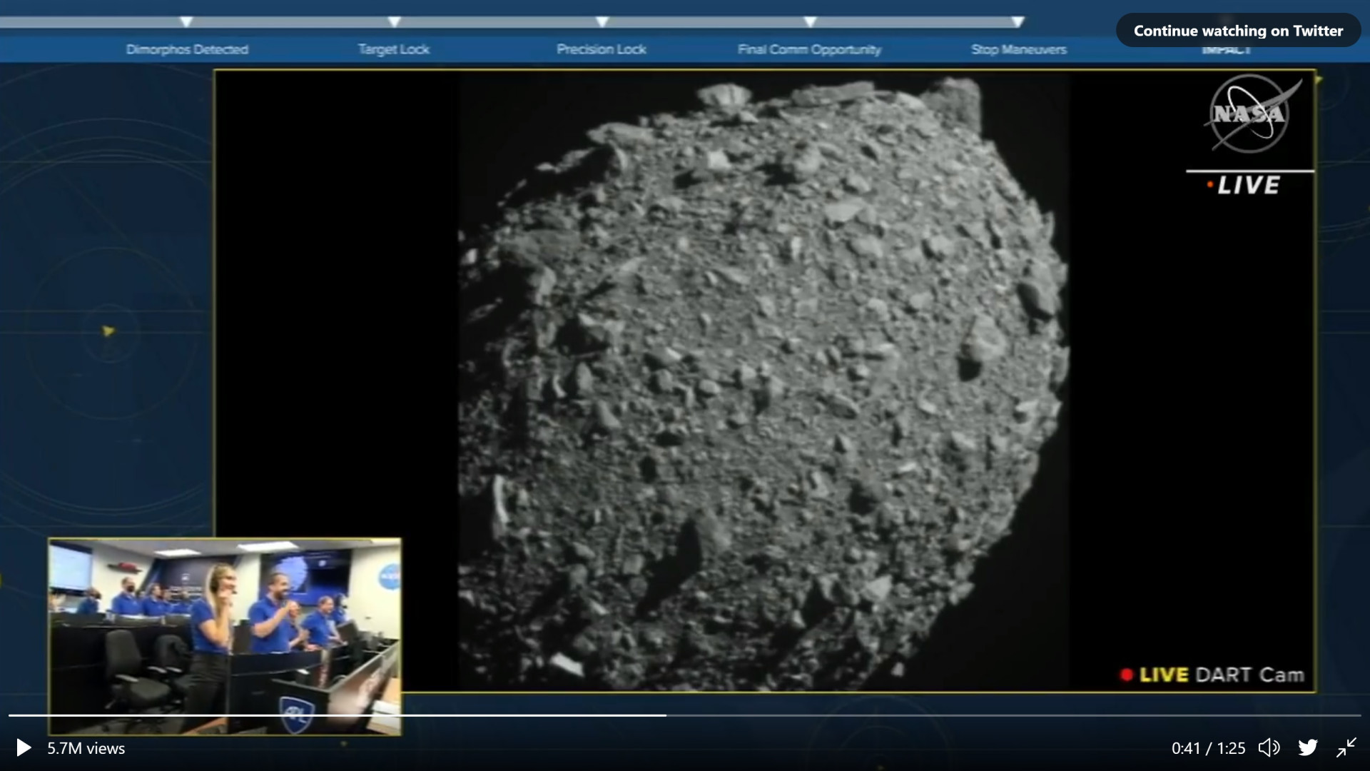 IMPACT SUCCESS! Watch from #DARTMIssion’s DRACO Camera, as the vending machine-sized spacecraft successfully collides with asteroid Dimorphos, which is the size of a football stadium and poses no threat to Earth. pic.twitter.com/7bXipPkjWD