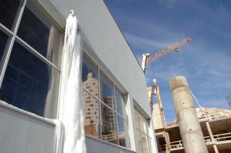 Několik ulic kolem nového newyorského Světového obchodního střediska bylo ve středu ráno uzavřeno, když vítr shodil ze střechy 541 metrů vysoké budovy kusy ledu zašpičatělé jako dýky. Ulice se znovu otevřely během dopoledne.