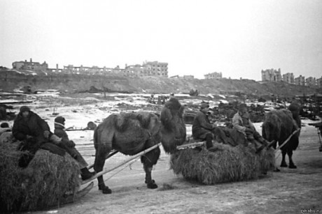 Je však veřejně prakticky neznámou skutečností, že významným pomocníkem, a to na obou stranách konfliktu, byli velbloudi! Jako tažná zvířata je použili Rusové v 308. střelecké divizi. Ta se v roce 1942 formovala v kazachstánské Astrachani v rámci 28. záložní armády. Kvůli nedostatku koní a nákladních aut zrekvírovala armáda pro divizi všechny dostupné velbloudy z okolí. Němci se k nim dostali později jako ke kořisti. Na obou stranách fronty byl pak využíván i jako spolehlivý tahoun saní s raněnými vojáky.