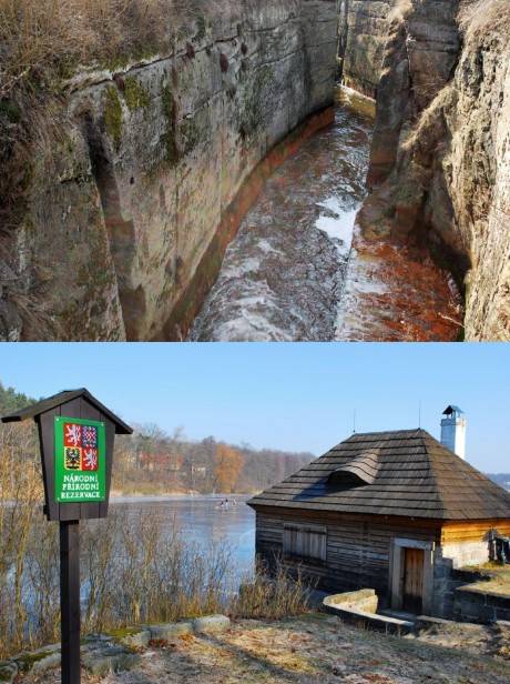 Ta, která rybník napájí se jmenuje Mnichovská, zásobená vodami Bobřího resp. Dolského potoka. Najdete ji u silnice č. 9 jižně od obce Zahrádky. Odtoková, konstrukčně složitější průrva zvaná Novozámecká, je dvakrát zalomená (patrně z důvodů tlumení povodňové vlny), odvádí vodu do Robečského potoka a po průchodu údolím Peklo za Českou Lípou ústí do řeky Ploučnice. Délka této průrvy je neuvěřitelných 175 metrů, maximální hloubka 14 metrů a šířka až sedm metrů. „No, musela to být těžká práce, vytesat to celé ručně “, říkám si stojíce nad propustí dřevěné zastřešené lávky, ze které je do průrvy dobře vidět. Kopii dřevného stavidla ze 17. století pod návalem uznání práce dávných robotníků pomalu ani nevnímám. Dokonce i na scénu z pohádky Z pekla štěstí štěstí, která byla natočena právě zde, se rozpomenu až mnohem později.