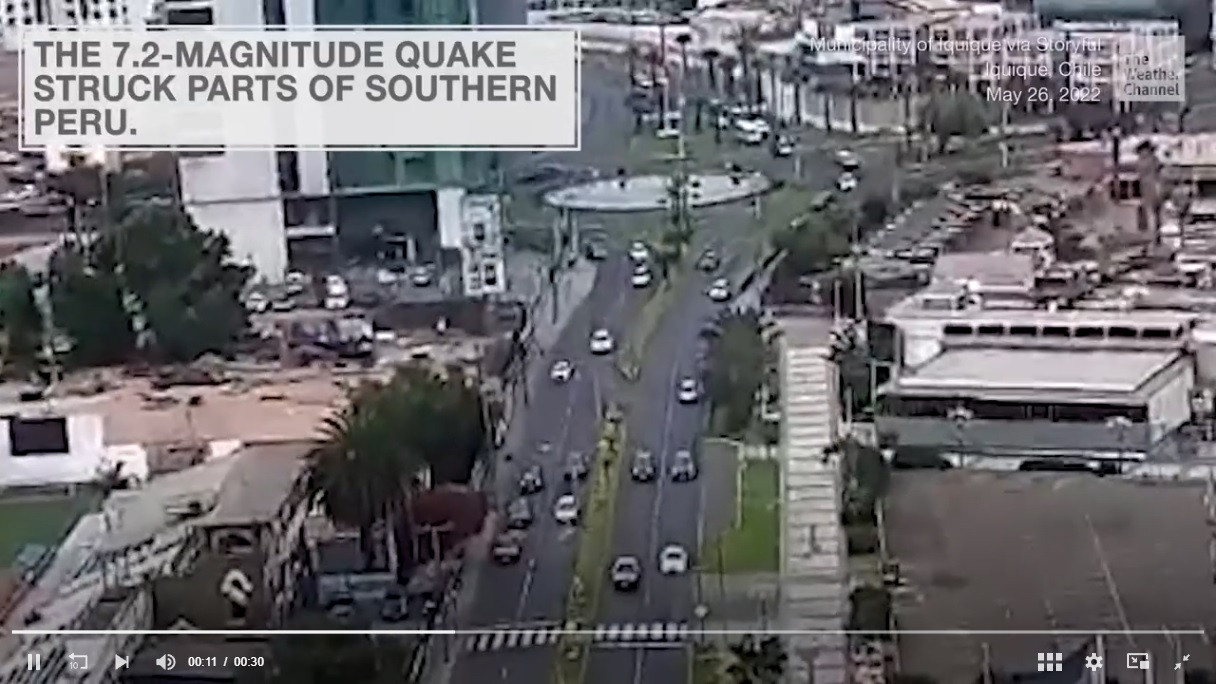 Bezpečnostní kamery zachytily před dvěma dny okamžik, kdy části Peru zasáhlo zemětřesení o síle 7,2 stupně.